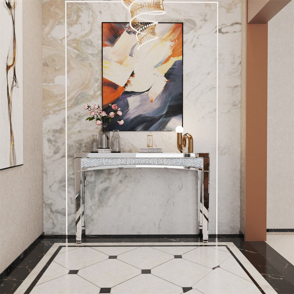Mirrored Entryway TableThe mirrored surface reflects lights and surrounding area, which make the room appear larger and more open, create an illusion of spaciousness, the 120cm long tabletop great for displaying artworks, metallic, seasonal blooms, other decorative objects, incorporating mirrored furniture also can dramatically change the look and feel of your homes