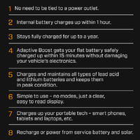 The CS FREE is the world’s first fully portable battery charger and maintainer with Adaptive Boost to get your flat battery going quickly and safely – without the need for mains power. In other words, it’s a 12V power bank for your vehicle that works with both lead-acid and lithium (12V LiFePO4) batteries. Plus, it’ll keep your portable tech, like phones, laptops cameras topped up too. So simply charge it up, take it with you and use it anywhere!