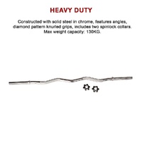 This bar accepts Standard-style weights up to a total capacity of 130kg. The bar itself weighs 6.4kg (14 lbs). Chrome plated and made from solid steel with knurled grips, this bar is built gym-tough. Two spin lock collars are included with your purchase.