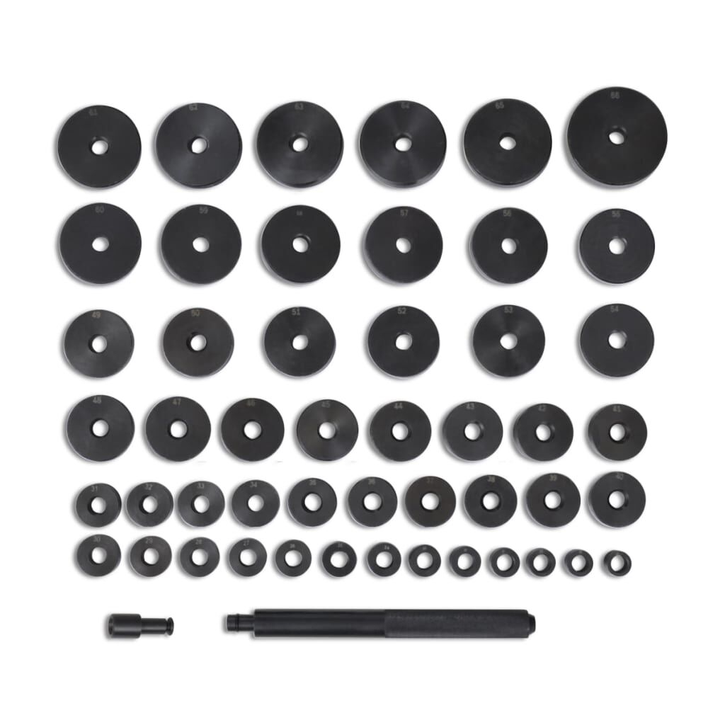 This master set allows you to build your own custom bushing driver, really a must have for garage and DIYs. It has every size you will ever need for most vehicles. No need to take the trouble to find a socket that close to the size of your bearings any more. With this kit at hand, you will just need to select the required sizes and then assemble your drivel tool, thus to get the job done promptly, efficiently and professionally. The plates can be used manually with a hammer / handle or with hydraulic presses.Made of special carbon steel with black oxide, the kit is designed for long life in daily workshop use. And all tools are supplied in a blow mold case for easy storage and transportation.