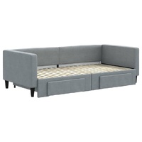 This 2-in-1 daybed with trundle, serving as both a sofa and bed, makes a practical and eye-catching addition to your living room or bedroom. Versatile daybed: The sofa bed functions as a sofa during the day and easily converts into a double bed at night by pulling out the trundle, providing a convenient solution for hosting guests and maximising space. Ample storage space: This guest bed has two drawers with wheels that provide ample space for storing your clothes, socks, toys, cushions, etc. Durable fabric and solid construction: This day bed sofa has a sturdy frame made of wood and metal and is upholstered in durable and comfortable fabric. Good to know:Mattresses are not included with this daybed. We do offer a various selection of mattresses. You can check our shop for matching mattresses.