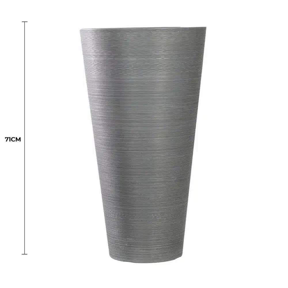 This tall round grey planter is made from exceptionally high-quality recycled materials that exceed the performance of most traditional pots and planters. The environmentally friendly round planter is the perfect choice for anybody wanting a low-maintenance planter for either indoors or outdoors that will last for years. Finished with a simply stunning textured lined surface youll absolutely love this super planter. There is a hole with a plug in the base to allow for drainage should you require.