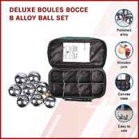 Our deluxe boule set is not only shiny and beautiful it guarantees family fun for hours on end. The set comes with eight 75mm diameter boules of polished alloy, one 35mm wooden jack, a measuring device that will settle any scoring disputes and a green canvas carrying bag that makes the game mobile and easy to transport.