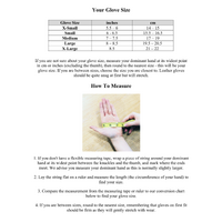 If you are not sure about your glove size, measure the hand you normally write with at its widest point in inches (excluding the thumb), then round down to the nearest half or whole number - this will be your glove size.
