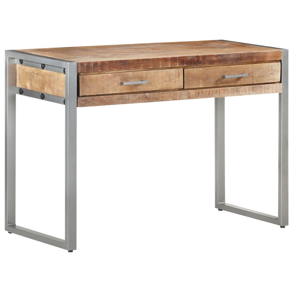 This industrial-style wooden desk exudes a vintage charm and will make a timeless addition to your home. The computer table is made of rough mango wood, a tropical hardwood with the strength to bear the weight. It also stands the wear and tear of time, making it stable and durable. The iron frame also adds extra stability. The wooden desk has two drawers providing ample space for storing small items such as keys, notebook, and other knick-knacks. The office desk can also be used as a writing desk or console table. Important note: Colours and grains may vary from piece to piece, making each piece unique. The delivery is random, ensuring the exclusivity and individuality of your product.