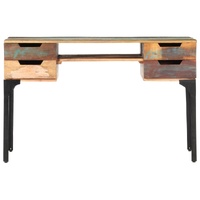 This wooden desk adds a vintage style to your living room and office. The writing desk is made of solid reclaimed wood and retains the characteristics of different types of wood. Reclaimed wood is already aged, weathered and dried. Hence, they don't shrink or bend. The black powder-coated iron legs provide extra stability for the table. The craftsmanship and the beautiful wood grains make every piece of furniture unique and slightly different from the next. This console desk also features 4 drawers and 1 shelf, providing ample storage space for keeping your essential items organised and within reach. Important note: Colours and grains vary from piece to piece, making each piece unique. The delivery is random, ensuring the exclusivity and individuality of your product.