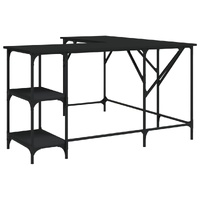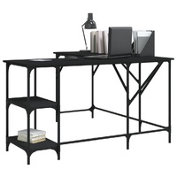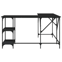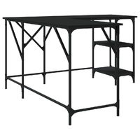 This simplistic desk is meant to be a practical as well as a decorative choice for your living space! Durable material: The engineered wood is of exceptional quality with smooth surface and also features strength, stability and resistance to moisture. Made of engineered wood, the office desk is easy to clean.Ample storage space: This computer desk with shelves offers ample storage space to keep your computer, folders, documents, decorations and other essentials well organised and within reach.L-shaped design: The writing desk features an L-shaped design, making it easy to fit snugly in any corner to maximise your limited space.Adjustable feet: The adjustable feet with plastic pads keep the standing desk balanced on uneven ground and increase stability.Metal frame: The metal frame adds an industrial style to your interior while ensuring durability and stability. Warning:To prevent it being overturned, this product must be used with the provided wall attachment device.