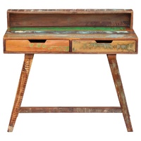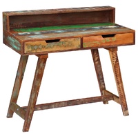 This vintage-style wooden desk, made of solid reclaimed wood, will make a timeless addition to your home. The tabletop provides a stable and secure surface on which you can place your drinks, a fruit basket or vase or other decorative items. It has two drawers, which provide ample space for storing small items such as keys, notepads, and other knick-knacks. The desk can be used as a computer table, worktable, office desk, reading table, study table, etc. The desk is made of recycled wood, which means every piece of furniture is unique and slightly different from the next. Furniture made of reclaimed wood has the characteristics of different woods, like teakwood, acacia, mango wood, saal wood, etc. Reclaimed wood is solid, stable, durable, and beautiful. Signs of wear and visible grain structure give each piece its own history and unique look. The desk is fully handmade, and the craftsmanship adds to its spectacular retro style. Every step of the process is carried out with the greatest care, be it recombining, polishing, painting or waxing. Important note: Colours vary from piece to piece, making each of our desks unique. The delivery is random, ensuring the exclusivity and individuality of your product.