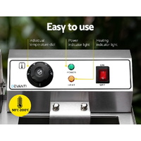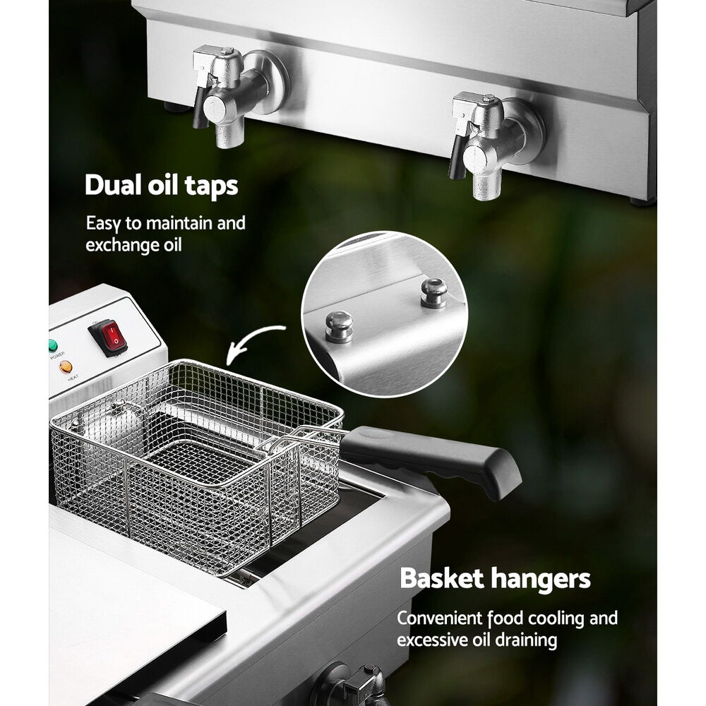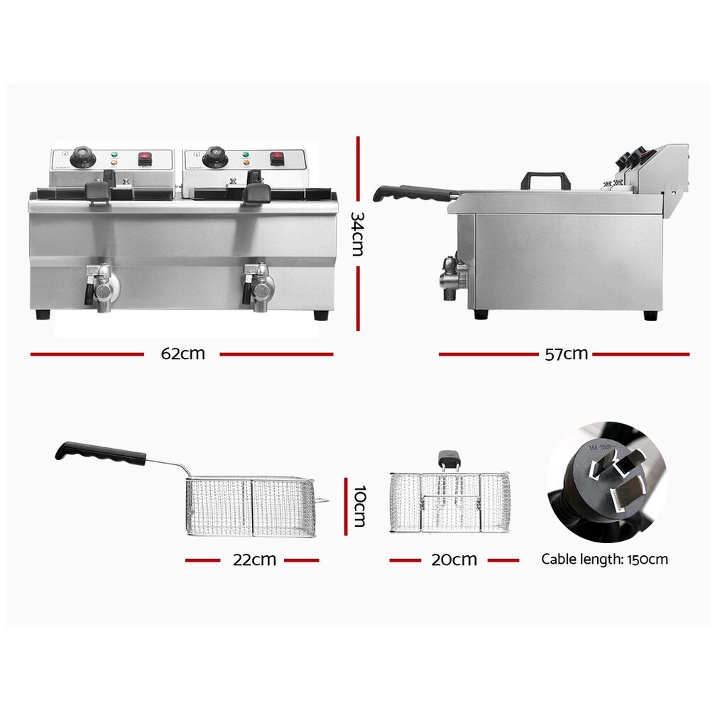 $284.81Practical, reliable and durable. That essentially sums up our Devanti Commercial Deep Fryer. Our food-grade stainless steel countertop twin deep fryer is versatile and safe to use in every way. With its S-shaped heating element, the deep fryer has a fast heat-up and recovery times, and even heat distribution to keep up with a busy kitchen. It comes with independent switches for each frying compartment so that you can cook at different temperatures simultaneously with no mixing of flavours. The stainless steel lid covers help to prevent splashing oil as well as keeping impurities out. The handles are also made heat-resistant for safety while the basket hangers make it convenient to cool down food or drain excessive oil from the frying baskets. Cleaning and maintenance of the deep fryer is also made hassle-free with oil drain taps to discard used oil and a 90? tilting head for easy accessibility to the whole fryer. Other safety features include oil level indicators, temperature probe to monitor overheating, overload circuit breaker, non-slip rubber feet and a SAA-certified 15A plug.