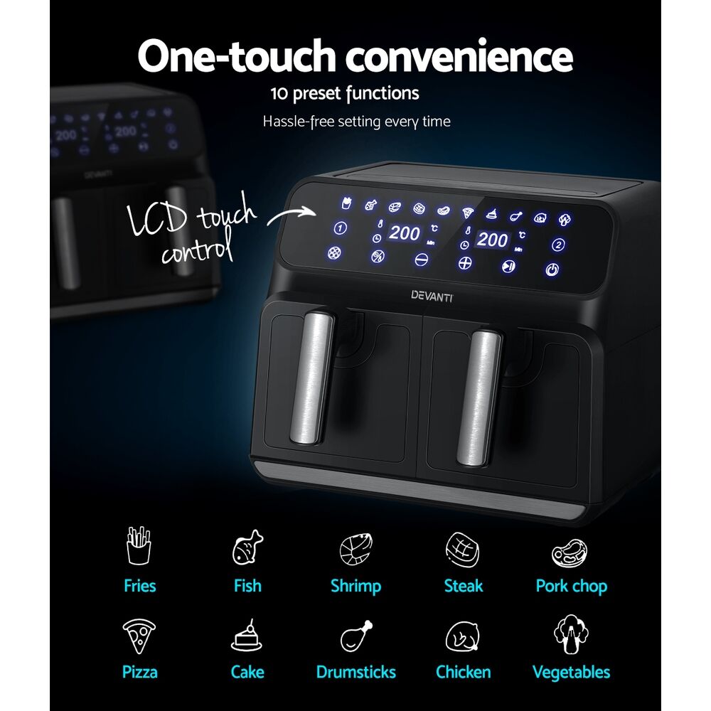 $122.19Enjoy your favourite fried foods without guilt thanks to the Devanti 8L Air Fryer. With their smooth and stunning sleek exterior, our Devanti Air Fryers turn ordinary food into extraordinary dishes thanks to their exceptional cooking abilities. With its innovative air frying technology and 1700W of power, heat is evenly dispersed throughout the air fryer so you can cook quickly and efficiently. The 8L capacity is suitable for a full set of meals from sides to mains, and the dual 4L baskets can be set at separate temperatures and times so you can save time and cook multiple dishes at once. Better still, all this wonderful cooking is done without a drop of oil and is as delicious and succulent as your favourite fried treats. Foods cooked in our air fryer have up to 80% less fat than regular deep-fried foods. Choose the time, temperature and cooking preset with the easy-to-use LCD touch control panel. The interior features a non-stick pan for easy cleaning and a removable crisper tray for the ultimate crispy, crunchy experience. It also features an automatic shut-off switch, a cool touch handle, a heat shield vent, and non-slip feet for safety. Most importantly, the components are all dishwasher-safe, making cleaning as easy as pie. Get yours today and see the benefits of fat-free cooking!