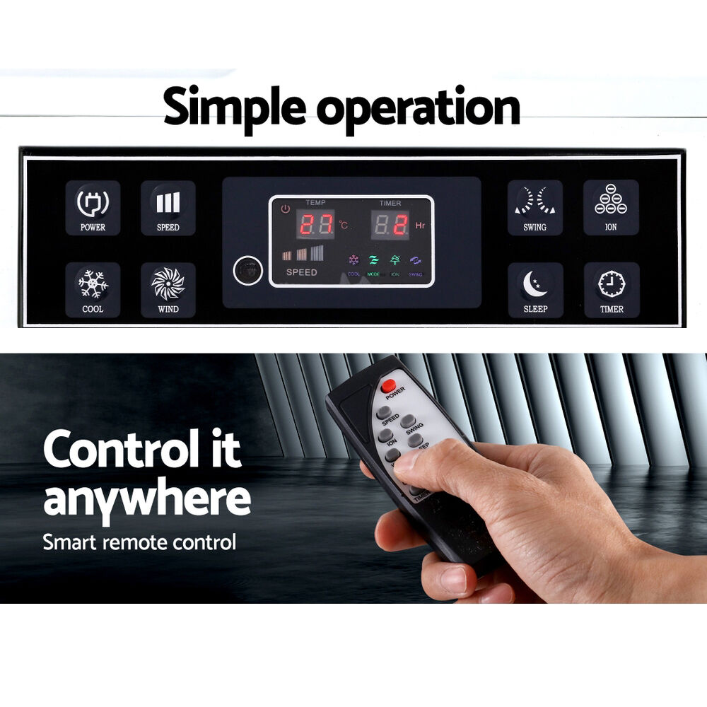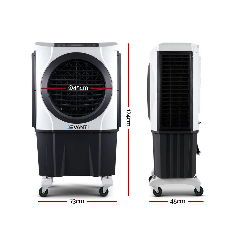 $504.77Our Devanti Evaporative Air Cooler is a monster of an air cooler. It has a huge 60L water tank so that you can keep cool for hours without having to top up the water often. You can also add ice to the cooler for more efficient cooling. The placement of water filters on three sides and the whirlwind airflow of up to 5,000m³/h allows the cooler to rapidly deliver super cool breezes throughout rooms as large as 50m² with its adjustable louvres and automatic swing mode. The removable dust filter effectively eliminates all pollutants such as dust, pollen, cigarette smoke, bacteria and odours, to deliver purified air. The evaporative air cooler utilises a 3-speed fan with three working modes (normal, natural and sleep), and is fitted with four lockable castor wheels for easy mobility. Not least, the LED digital control panel enables easy operation, with a remote control included for extra convenience.