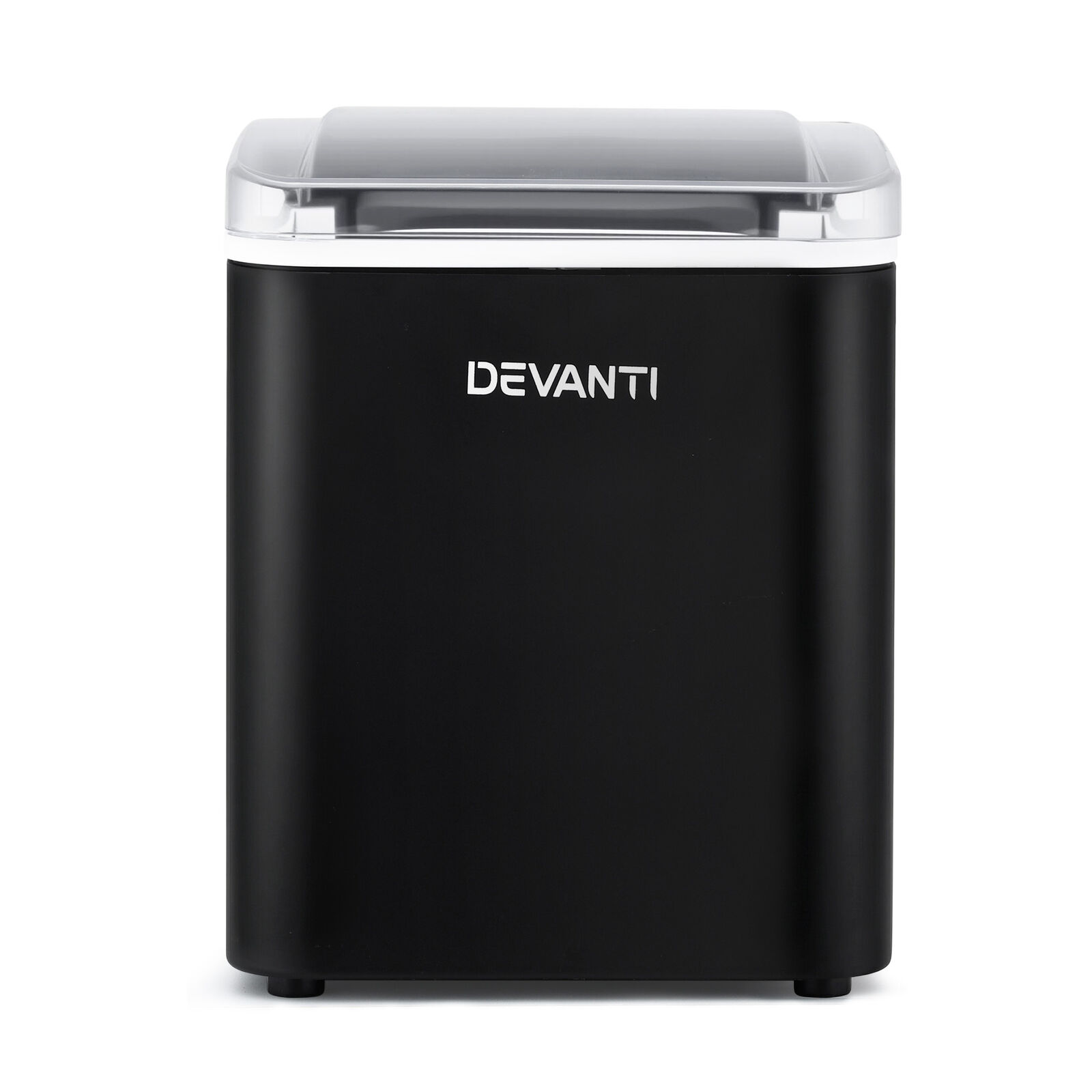 Enjoy instant ice anytime! The Devanti Portable Ice Maker produces 9 bullet-shaped cubes in just 6-7 minutes, up to 12kg daily. With self-cleaning, smart alarms, and quiet operation, this compact black machine fits perfectly in your kitchen or office. Includes scoop and basket - just plug in and enjoy chilled drinks all day!