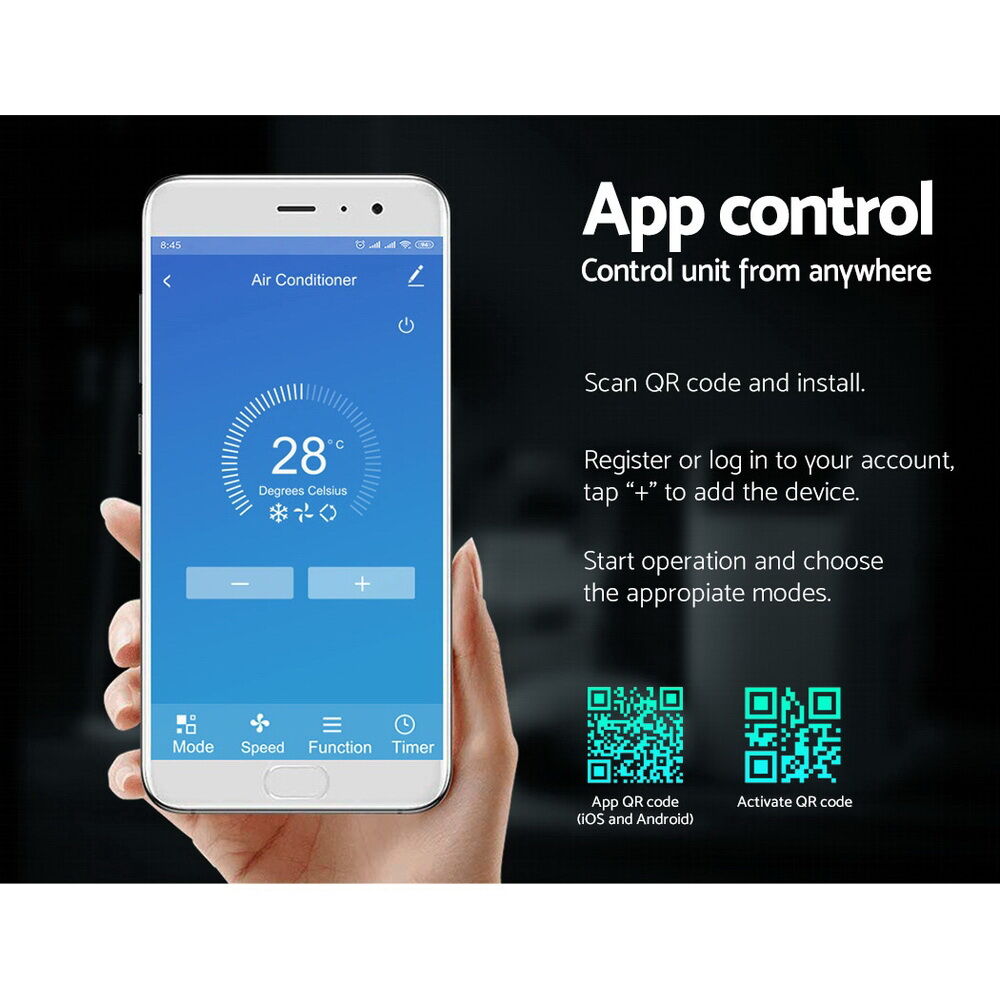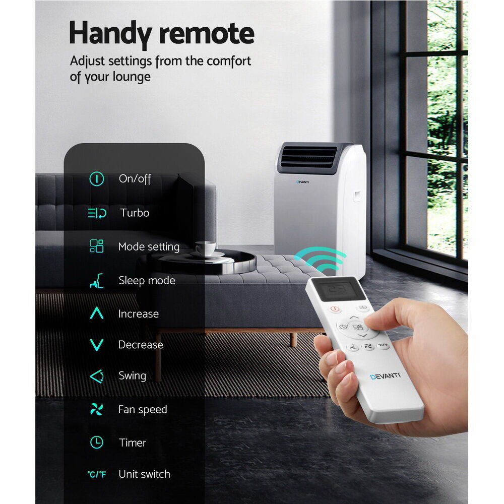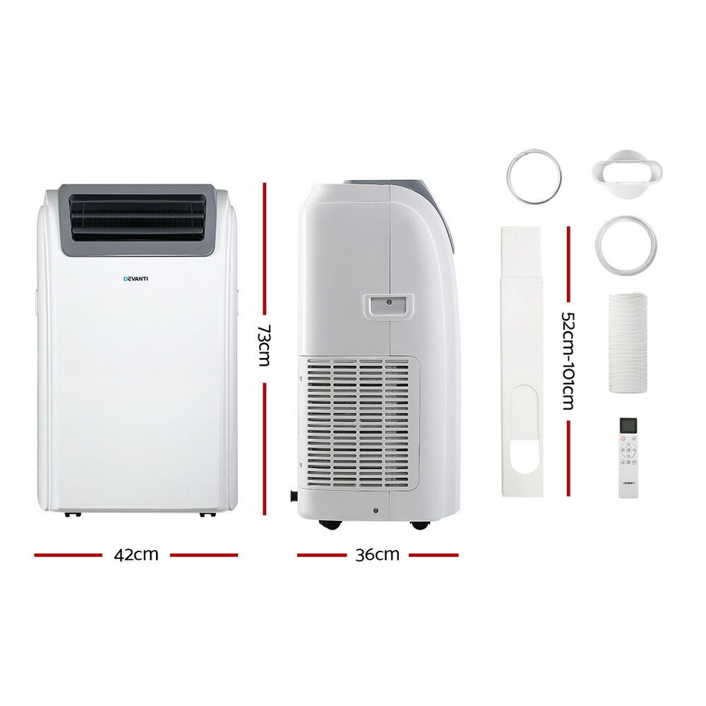$509.47Hot days are not too far away. So why not pick up our Devanti Portable Air Conditioner to help you stay cool comfortably and economically throughout the season. The air conditioner is three appliances rolled into one: air conditioner, 4-speed fan and dehumidifier. There is also an additional automatic water vaporisation system so that you do not need to empty the water tank. The air conditioner rapidly delivers super cool breezes throughout rooms sized 20m² to 30m². In whichever mode you are using, you can always count on ample cool air at your preferred temperature settings. The LED display allows for a clear glance of all your settings. A handy remote control lets you control the settings from the comfort of your lounge, while the Wi-Fi connectivity truly lets you take control from anywhere. The air conditioner can also be set to work for a pre-set number of hours with its 24-hour timer. Built-in handles and castor wheels make the air conditioner very portable so that you can keep cool wherever you are. An included adjustable window exhaust kit enables easy installation of the exhaust hose for hot air to be extracted easily. Do not let the heat and wet get you down this summer. Rise up to a cool and refreshing ambience with our portable air conditioner.
