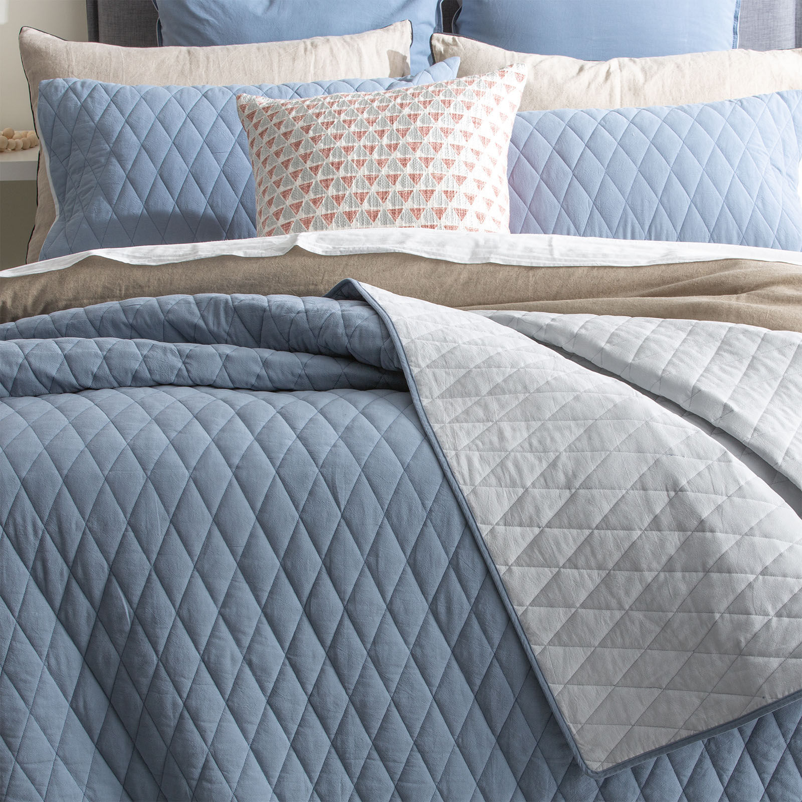 Diamante Coverlet evokes feelings of a summer holiday with it's gorgeous sea inspired colour palette. Stone washed cotton base fabric and diamond quilting pattern. This effortless reversible design is perfect for layering as extra warmth in winter and as a light layer in Summer.