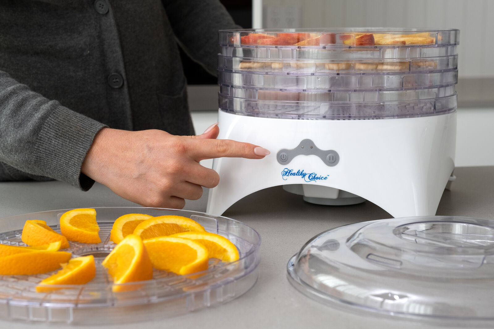 This Basic Food Dehydrator allows you to prepare and dehydrate a variety of foods with just two simple touch buttons, so you can enjoy the ease of food dehydrating at home. Perfect for food dehydrating beginners, this ‘converge-flow’ drying system eliminates tray rotation, while ensuring the heated air is circulated through all compartments for consistent, even drying across all levels.