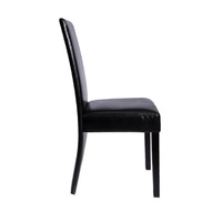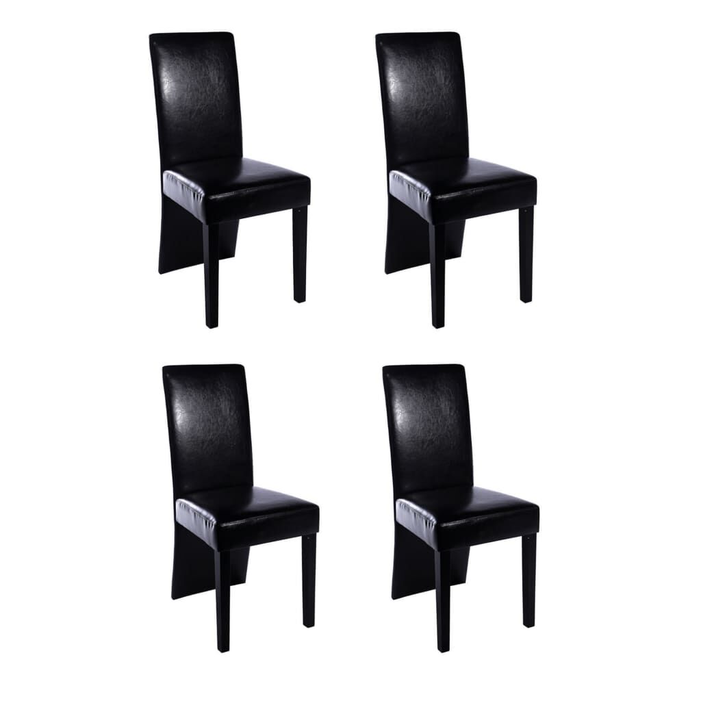 These 4 beautiful dining chairs have a modern design and will definitely stand out in your dining room or kitchen. The chairs are made of black artificial leather and the seats are filled with comfortable padding. This ensures that you're comfortable at the table for a meal, during a game or when involved in other activities. The chairs have solid wooden legs and are very easy to clean thanks to the artificial leather.