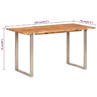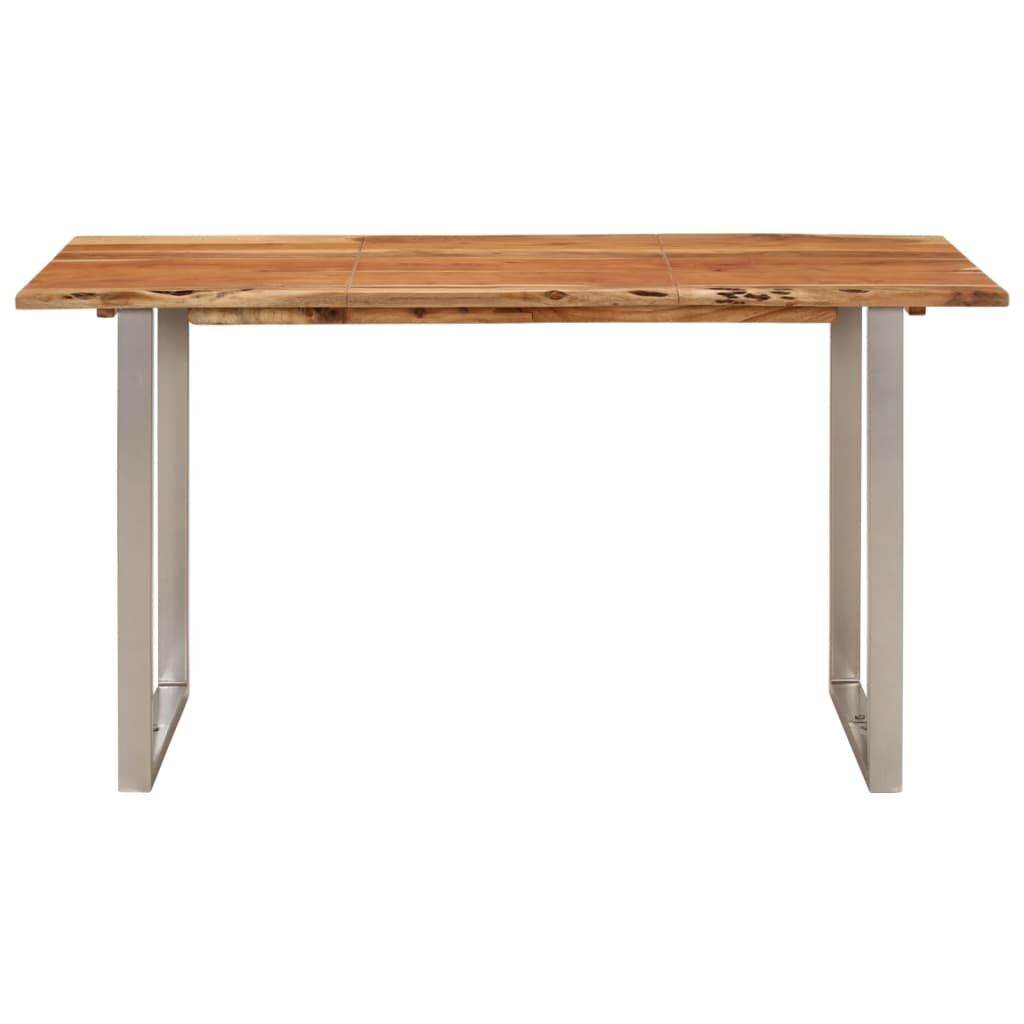 This wooden dining table will make a distinctive addition to your kitchen or dining room. Solid acacia wood: Solid acacia wood is a beautiful natural material. Acacia wood is a tropical hardwood, which is dense, sturdy, and durable.Lively shapes and edges: The lively shape and edges of the tabletop are deliberately processed, so that the original character and natural impression of tree are brought to your interior decor!Strong legs: The strong iron legs complete the industrial look and contribute to the sturdy construction.Wide application: This dining room table can meet your different requirements for it can also be used as a counter table, restaurant table or bistro table.Easy cleaning: This kitchen table is easy to clean with a damp cloth. Note:Each product comes with an assembly manual in the box for easy assembly.The colours and edges vary from piece to piece, making each piece unique. The delivery is random, ensuring the exclusivity and individuality of your product.