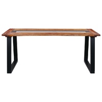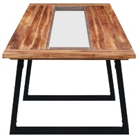 This wooden dining table has a cool, industrial style and will make a great addition to your dining room or kitchen. The tabletop is made of solid acacia wood and decorated with glass in the middle, which makes it an eye catcher. Its power-coated metal legs add to the industrial style and make the table very stable. The wood's live edge that follows the natural shape of the tree increases the beauty of the table. Assembly is really easy. Please note that wood is a natural product and may show imperfections.
