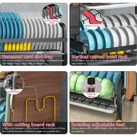 Capacity:The first tier can hold up to 18 plates, the second tier can hold up to 16 blows, and the third tier can hold cups and small pot, 2 sides are utensil holder, cutlery holder and cutting board holder.