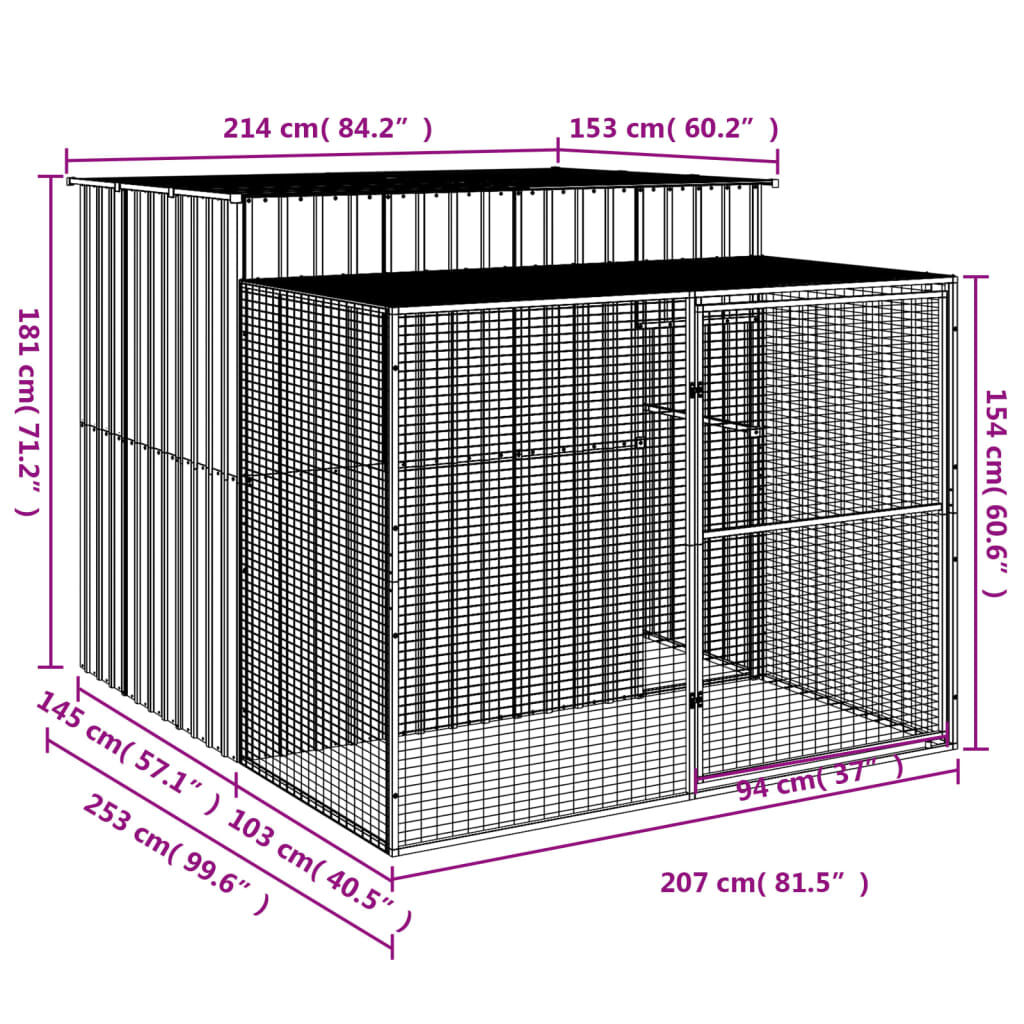 Provide safety and comfort for your furry friends with this dog house with run. Versatile use: Combing with the extended run, the versatile doghouse provides ample space for your pet. It features multiple uses: playing, exercising, training, or simply keeping your puppy safe. It will be the perfect play paradise for your furry friends!Durable construction: Thanks to the sturdy and heavy-duty galvanised steel construction, the dog kennel is durable and built to last.Mesh design: The mesh design of the extended run helps prevent mischief and unexpected accidents while enabling ventilation.Practical roof: The roof of the dog cage protects the puppy from the sun, rain, snow, and other weather conditions.Convenient access: There is an entrance to the animal house and a door with a latch on the extended run, both making it easy to get in and out.