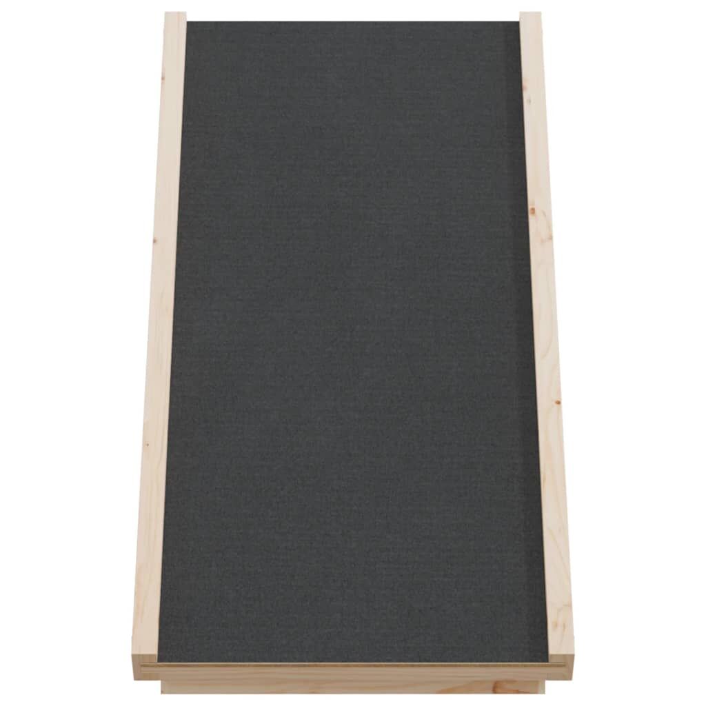 This dog ramp makes it easier for your dogs or other pets to get on and down high places. Stable construction: This pet ramp has a solid fir wood frame for stability and durability. Solid fir wood is a beautiful and durable material that maintains its integrity even when exposed to moisture. It does not dry out or warp, making it a reliable choice. Anti-slip surface: This canine ramp has an anti-slip polyester fabric surface, ensuring that your small furry friends can walk on it securely and without any risk.Adjustable height: The dog ramp can be adjusted to 30, 38, 45 cm, so your pet can easily reach heights such as cars, beds and sofas. The adjustable height provides a gentle slope that helps reduce your pets' muscle and joint tension caused by jumping. It also relieves their pressure on paws and joints.Easy storage: This dog ramp for car can be easily folded flat for easy storage when not in use.Suitable for most pets: The folding dog ramp is designed specifically for small to large-sized dogs, cats, and other pets. It enables them to effortlessly access beds, couches, cars, and more, while also ensuring their safety.