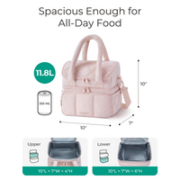 Stay organized and keep your meals fresh wherever you go with this double-layer insulated lunch bagengineered for performance, comfort, and everyday style. Designed with a smart two-compartment layout, it separates dry snacks from liquids or chilled items to prevent leaks and maintain food integrity. The leak-proof bottom section is ideal for drinks, yogurt, or meal prep containers, while the top zone keeps fruits, sandwiches, and dry goods secure and easily accessible. Built with 5mm EPE foam insulation and a food-grade PEVA interior lining, this cooler tote effectively maintains temperaturekeeping cold foods cool for up to 12 hours and warm dishes cozy for up to 6 hours. Lightweight yet spacious, it holds up to 11.8 liters, fitting full-sized containers, multiple beverages, and side dishes with room to spare. Smooth dual-zipper openings offer full 180 access, while thoughtful pocketsincluding a front zip compartment, interior mesh slot, and two stretchy side sleeveskeep utensils, napkins, ice packs, and water bottles neatly in place. Whether you're commuting to work, heading out for a picnic, or traveling, this reusable lunch bag blends practicality with modern aesthetics for a smarter way to carry your meals.