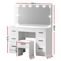 $275.41Feel like a star straight out of Hollywood with the Artiss Debbie Dressing Table. Packed with generous storage and other convenient features, your new beauty routine will be a breeze. Made from quality MDF particleboard with a melamine finish, the table is built to last. The Hollywood-style acrylic makeup mirror is surrounded by bright LED bulbs for the perfect illumination. Choose from warm, neutral and daylight white light so you can always look stage-ready. Seven generous storage drawers with sleek handles open smoothly on anti-rust runners, giving you instant access to your beauty essentials. A foam-padded PU leather stool allows you to sit comfortably while applying make-up or skincare and can be neatly tucked away when not in use. Easy to install and even easier to maintain, you'll love getting ready for the day in front of your new Artiss Debbie Dressing Table.