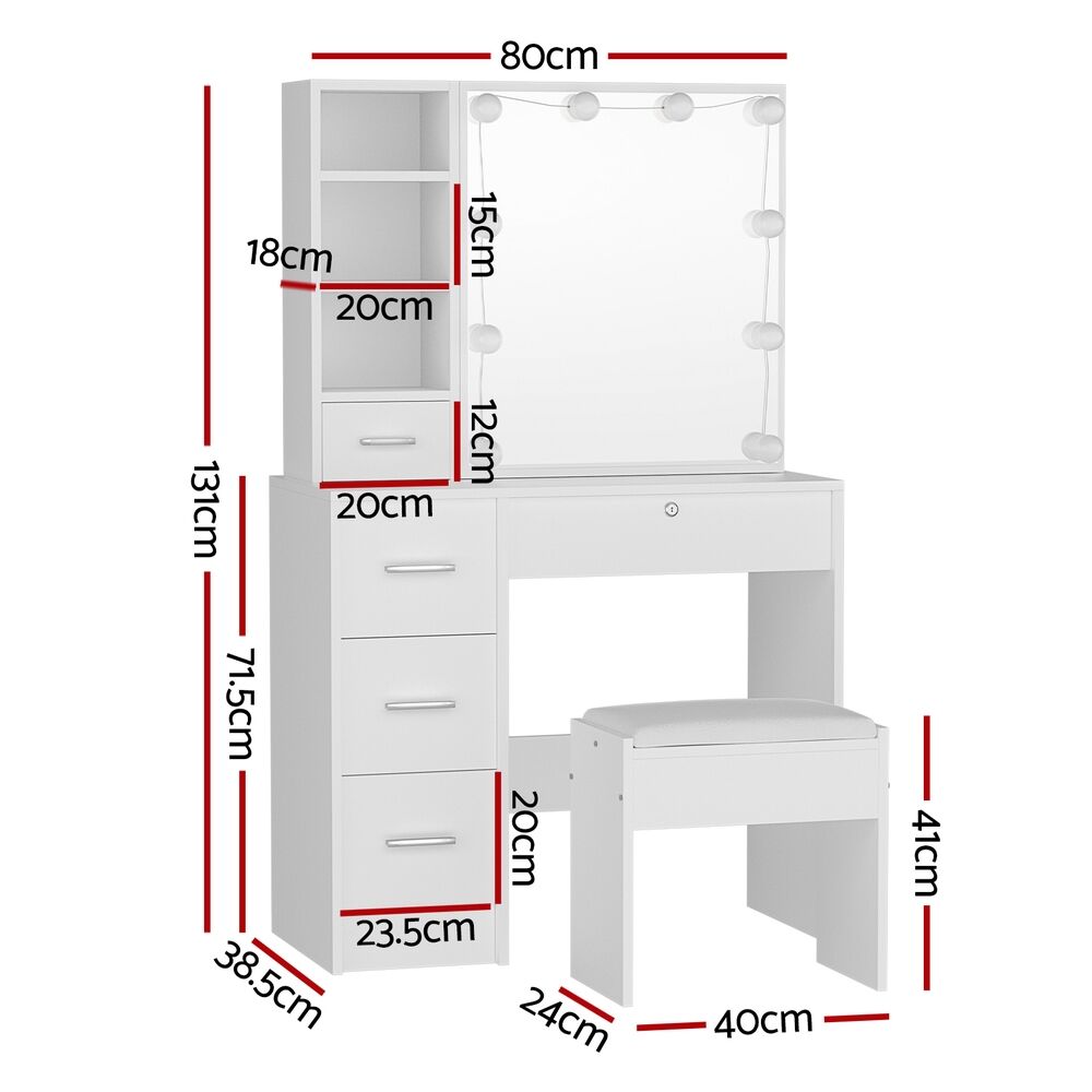 $183.29Feel like a star straight out of Hollywood with the Artiss Dylan Dressing Table. Packed with generous storage and other convenient features, your new beauty routine will be a breeze. Made from quality MDF particleboard with a melamine finish, the table is built to last. The Hollywood-style makeup mirror is surrounded by bright LED bulbs for the perfect illumination. Choose from warm, neutral and daylight white light so you can always look stage-ready. The vanity features three open shelves that you can use to display trinkets or beauty products. Five generous storage drawers with silver handles open smoothly on anti-rust runners, giving you instant access to your beauty essentials. A foam-padded PU leather stool allows you to sit comfortably while applying make-up or skincare and can be neatly tucked away when not in use. Easy to install and even easier to maintain, you'll love getting ready for the day in front of your new Artiss Dylan Dressing Table.