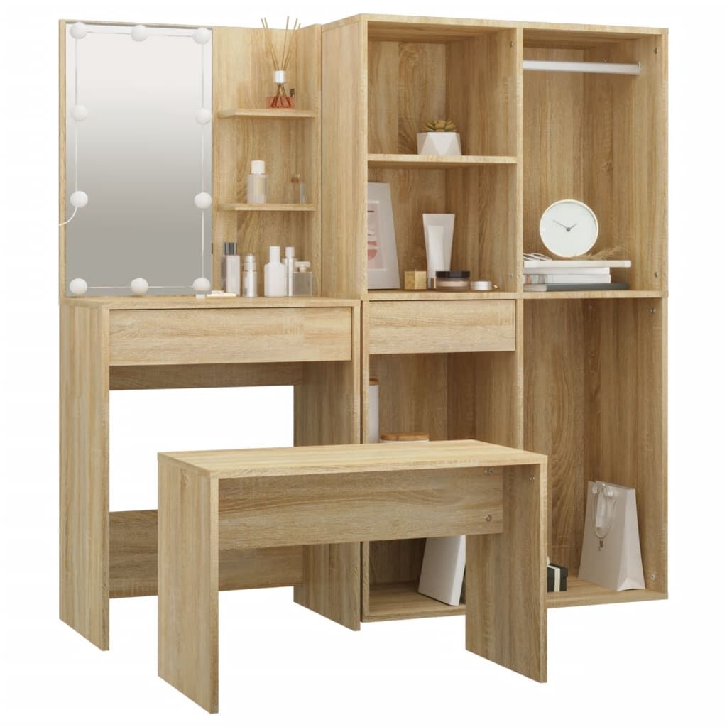 The trendy dressing table set gives your bedroom a timeless, refined look. The dressing table set with LED is a perfect addition to your bedroom decor and also keeps your cosmetics close at hand! Stable material: The engineered wood is of exceptional quality with smooth surface and also features strength, stability and resistance to moisture.Utility mirror: The dressing table with mirror is perfect for your daily beauty routine. The mirror allows you to take care of your facial skin and wear your makeup too!Ample storage space: The dressing table with stool provides ample space for easy access to your make-up, jewellery and everyday essentials.LED light: The dressing table also has LED bulbs with USB, which are easy to switch modes from warm to cold white. The featured LED bulbs around mirror illuminate your beauty as well.Wide applications: This dressing table set is suitable for various scenes, such as your bedroom, cloakroom and any other room you want to place it in. WARNING:In order to prevent overturning, this product must be used with the wall attachment device provided. Note:Each product comes with an assembly manual in the box for easy assembly.