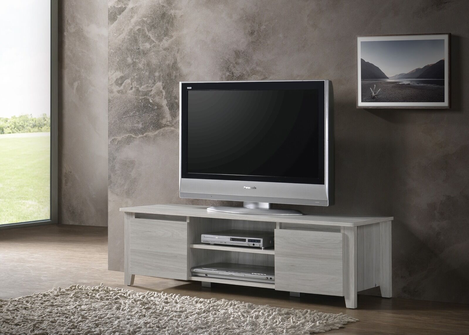 $138.13Function meets flair with this sophisticated TV stand. The white oak finish, clean and sleek details reinforce the contemporary vibe. Its distinctive look draws the eyes to your entertainment ensemble. The two divided storage cabinets accommodate sound bars, cable boxes, game consoles and other gadgets, while four open shelving put home accents on display.
