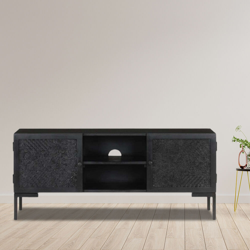 $188.93This wooden TV cabinet adds an industrial charm and makes it a perfect choice for your interior living space. The stereo cabinet is made of solid mango wood, a tropical hardwood with the strength to bear the weight. It also stands the wear and tear of time, making it stable and durable. The powder-coated steel frame also provides extra stability. The media unit also features 2 shelves and 2 doors providing ample space for storing your multimedia appliances, books as well as various other items. Important note: Colours and grains vary from piece to piece, making each piece unique; the delivery is random.