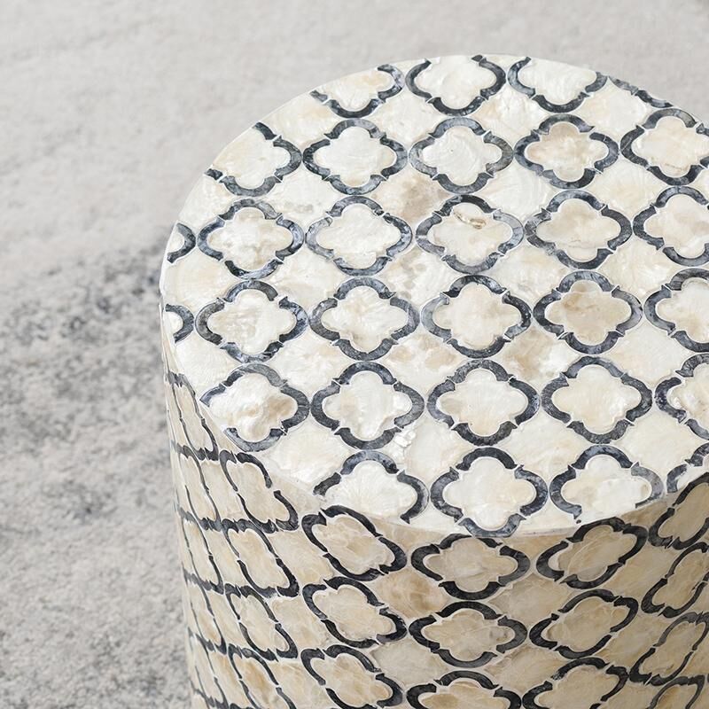 $217.13A round side table, stool or foot rest introducing the beach inspired side table. Adorned with discs of real sea shells that shimmer when they catch the light, this is a furniture piece that will instantly brighten and transform a space. Invest in a pair as bedside tables, use it as a stool for your desk, or as a stand-alone decor piece to rest a plant on, or even coffee table books.