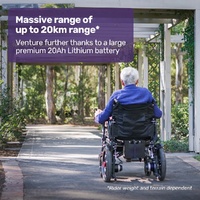 Twin motors offering a total of 500 watts offer an enjoyable riding experience with smooth and responsive performance, not to mention the ability to climb hills and ramps right up to a 15-degree incline! A tight 1.1m turning circle offers the manoeuvrability you need on paths and in places like shopping centres, parks and supermarkets.