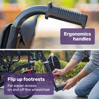 Getting on and off this Equipmed Power Wheelchair is easy thanks to swing-up armrests and the swing-up footrest. The retracting armrests also give you the option of dining at a table.