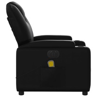 Sit back and drift away in this highly comfortable electric massage recliner chair! Electric reclining function: This recliner chair is equipped with an electric motor that helps automatically adjust the footrest and backrest to any position as per your comfort with a simple press of the button on the side of the chair. This feature allows for a maximum tilt of 135 degrees. Additionally, the backrest can go automatically back to the original place with an easy press of the button. Vibration function: The featured 6 massage points let you experience a better-targeted massage. Additionally, the included hand control allows you to pick different massage programs. The massage function is powered by the USB connector that requires a certified 5V USB power source (not included). Comfortable seat experience: The thickly padded seat, backrest, and wide armrests covered in faux leather provide a cosy and warm sensation, making you feel embraced while seated. The faux leather is a highly durable material. It is resistant to stain, making it easy to clean with a damp cloth. The smooth surface also gives a luxurious look and the beauty of real leather. Convenient cup holders and side pocket: This armchair has two convenient cup holders for your drinks and a side pocket for your remote control or keeping your essential items within easy reach. Solid and stable frame: The frame made of wood and metal provides a strong structure and stability. This reclining armchair is comfortable and durable.