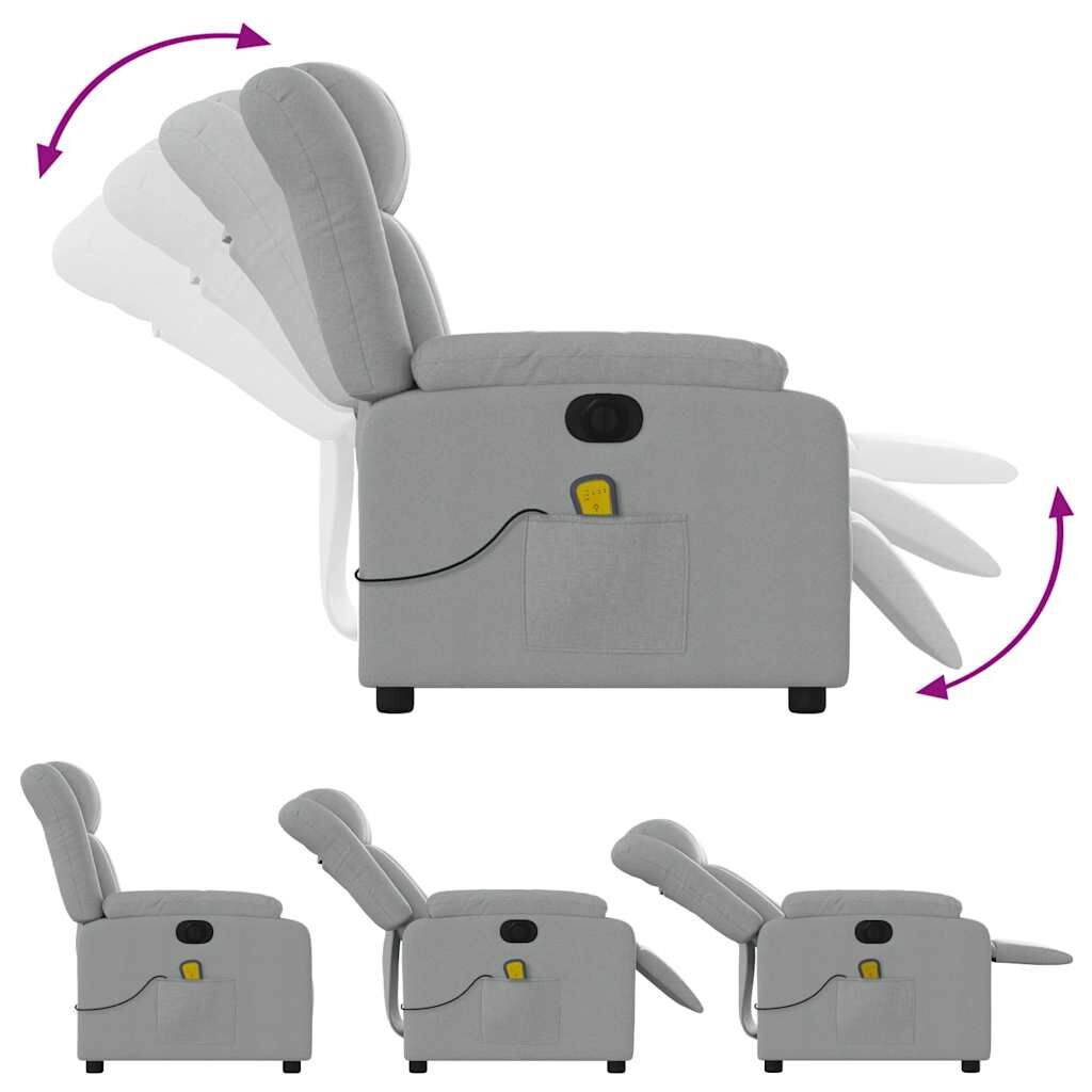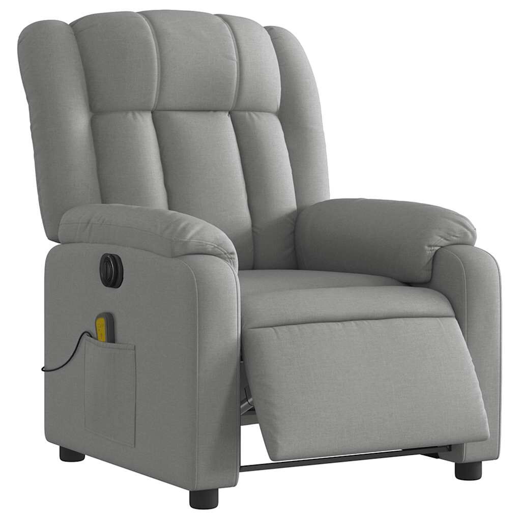 Sit back and drift away in this highly comfortable electric massage recliner chair! Electric reclining function: This recliner chair is equipped with an electric motor that helps automatically adjust the footrest and backrest to any position as per your comfort with a simple press of the button on the side of the chair. This feature allows for a maximum tilt of 135 degrees. Additionally, the backrest can go automatically back to the original place with an easy press of the button.Vibration function: The featured 6 massage points let you experience a better-targeted massage. Additionally, the included hand control allows you to pick different massage programs. The massage function is powered by the USB connector that requires a certified 5V USB power source (not included).Comfortable seat experience: The thickly padded seat, backrest, and wide armrests covered in fabric provide a cosy and warm sensation, making you feel embraced while seated. The fabric features a simple and clean look and is breathable and durable.Convenient side pocket: This armchair has a side pocket for your remote control or keeping your essential items within easy reach.Solid and stable frame: The frame made of wood and metal provides a strong structure and stability. This reclining armchair is comfortable and durable.