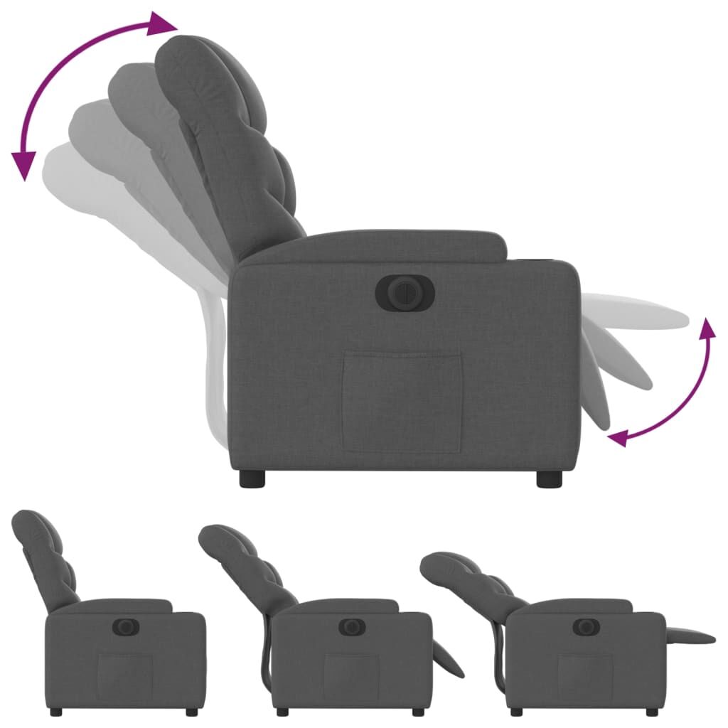 Sit back and drift away in this highly comfortable electric recliner chair! Electric reclining function: This recliner chair is equipped with an electric motor that helps automatically adjust the footrest and backrest to any position as per your comfort with a simple press of the button on the side of the chair. This feature allows for a maximum tilt of 135 degrees. Additionally, the backrest can go automatically back to the original place with an easy press of the button.Comfortable seat experience: The thickly padded seat, backrest, and wide armrests covered in the fabric provide a cosy and warm sensation, making you feel embraced while seated. The fabric features a simple and clean look and is breathable and durable.Convenient cup holders and side pocket: This armchair has two convenient cup holders for your drinks and a side pocket for you to keep your essential items within easy reach.Solid and stable frame: The frame made of wood and metal provides a strong structure and stability. This reclining armchair is comfortable and durable.
