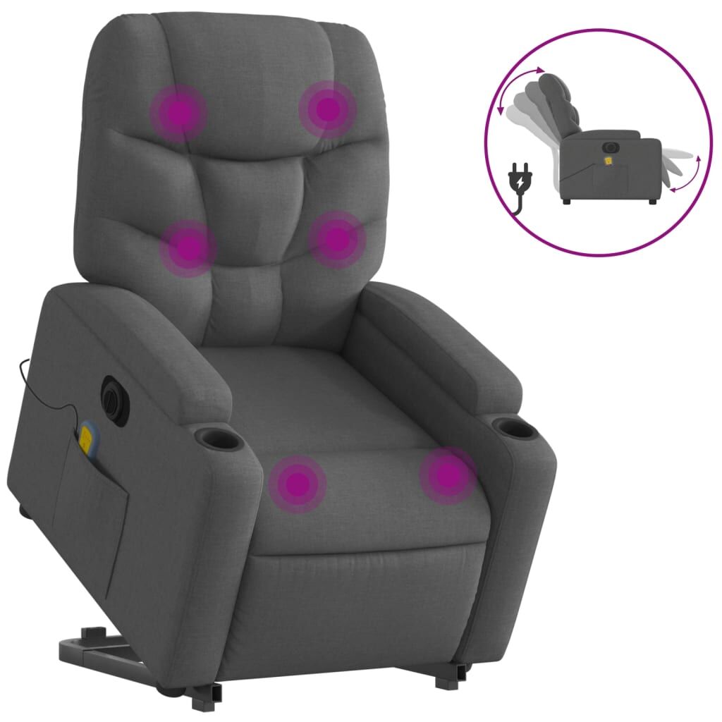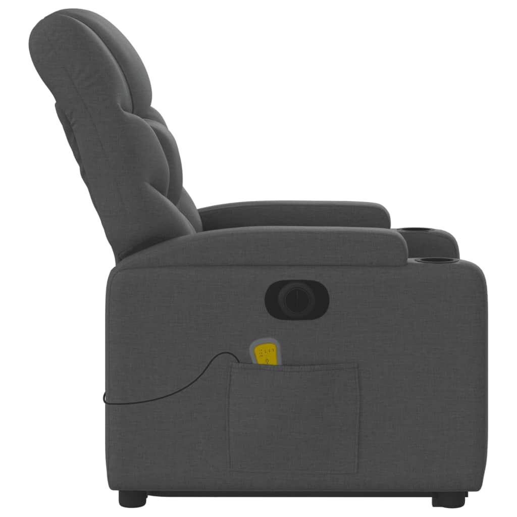 Sit back and drift away in this highly comfortable electric stand up massage recliner chair! Power lift function: This recliner chair for the elderly is equipped with an electric motor for the lifting-up function. Thanks to the function that pushes the entire chair up, you can easily stand without stressing your back and knees with a simple press of the button.Electric reclining function: This reclining chair is also equipped with an electric motor that helps automatically adjust the footrest and backrest to any position as per your comfort with a simple press of the button on the side of the chair. This feature allows for a maximum tilt of 135 degrees. Additionally, the backrest can go automatically back to the original place with an easy press of the button.Vibration function: The featured 6 massage points let you experience a better-targeted massage. Additionally, the included hand control allows you to pick different massage programs. The massage function is powered by the USB connector that requires a certified 5V USB power source (not included).Comfortable seat experience: The thickly padded seat, backrest, and wide armrests covered in fabric provide a cosy and warm sensation, making you feel embraced while seated. The fabric features a simple and clean look and is breathable and durable.Convenient cup holders and side pocket: This armchair has two convenient cup holders for your drinks and a side pocket for your remote control or keeping your essential items within easy reach.Solid and stable frame: The frame made of wood and metal provides a strong structure and stability. This reclining armchair is comfortable and durable.