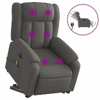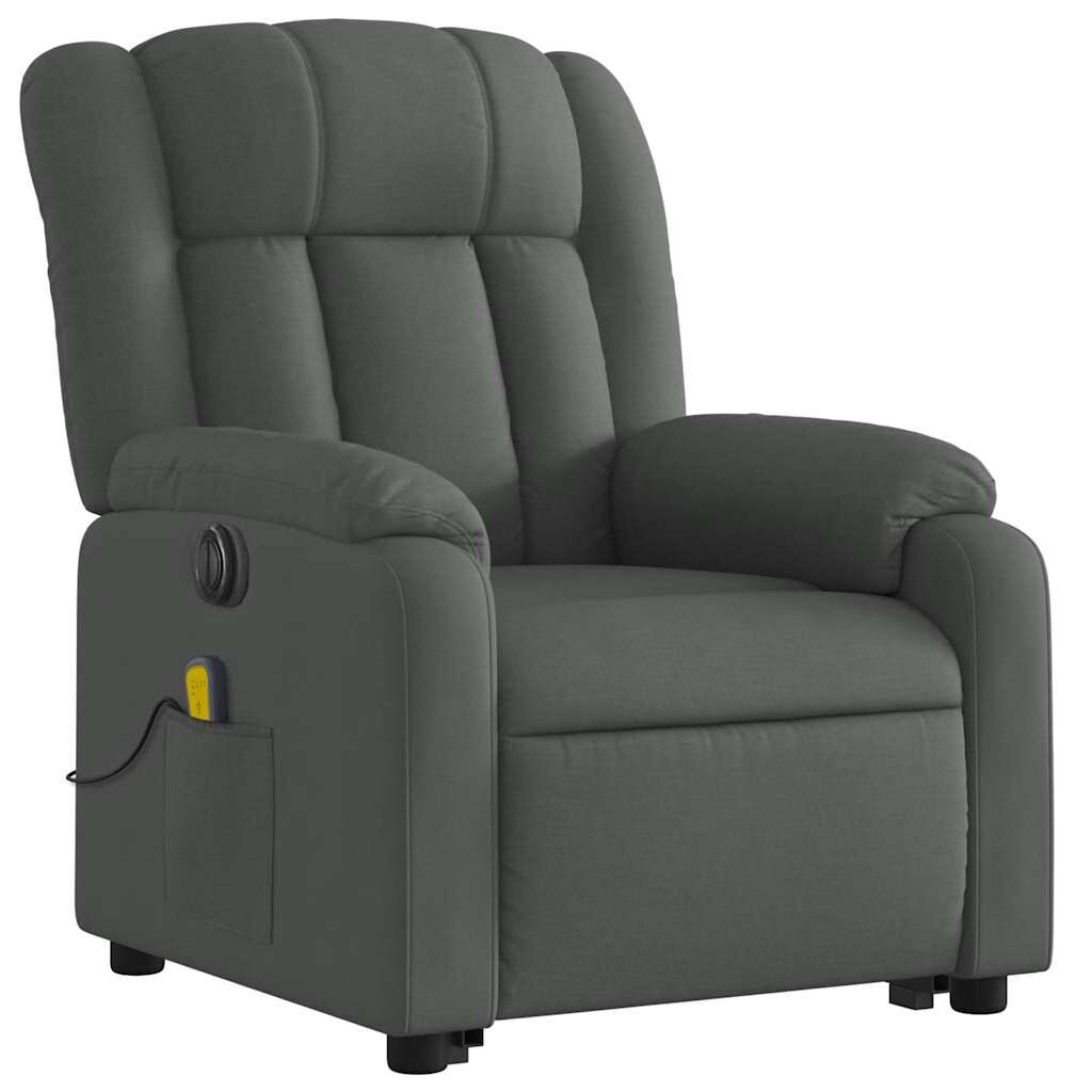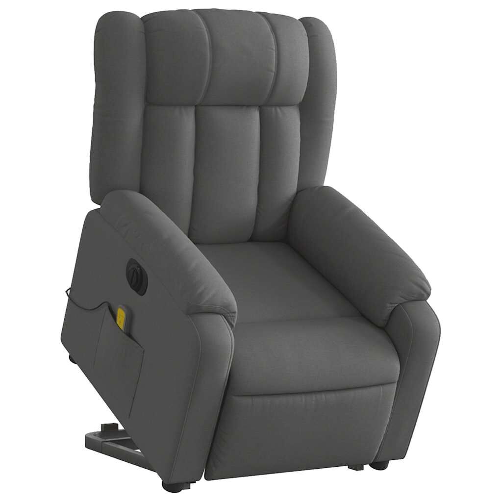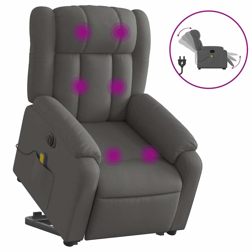 Sit back and drift away in this highly comfortable electric stand up massage recliner chair! Power lift function: This recliner chair for the elderly is equipped with an electric motor for the lifting-up function. Thanks to the function that pushes the entire chair up, you can easily stand without stressing your back and knees with a simple press of the button.Electric reclining function: This reclining chair is also equipped with an electric motor that helps automatically adjust the footrest and backrest to any position as per your comfort with a simple press of the button on the side of the chair. This feature allows for a maximum tilt of 135 degrees. Additionally, the backrest can go automatically back to the original place with an easy press of the button.Vibration function: The featured 6 massage points let you experience a better-targeted massage. Additionally, the included hand control allows you to pick different massage programs. The massage function is powered by the USB connector that requires a certified 5V USB power source (not included).Comfortable seat experience: The thickly padded seat, backrest, and wide armrests covered in fabric provide a cosy and warm sensation, making you feel embraced while seated. The fabric features a simple and clean look and is breathable and durable.Convenient side pocket: This armchair has a side pocket for your remote control or keeping your essential items within easy reach.Solid and stable frame: The frame made of wood and metal provides a strong structure and stability. This reclining armchair is comfortable and durable.