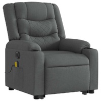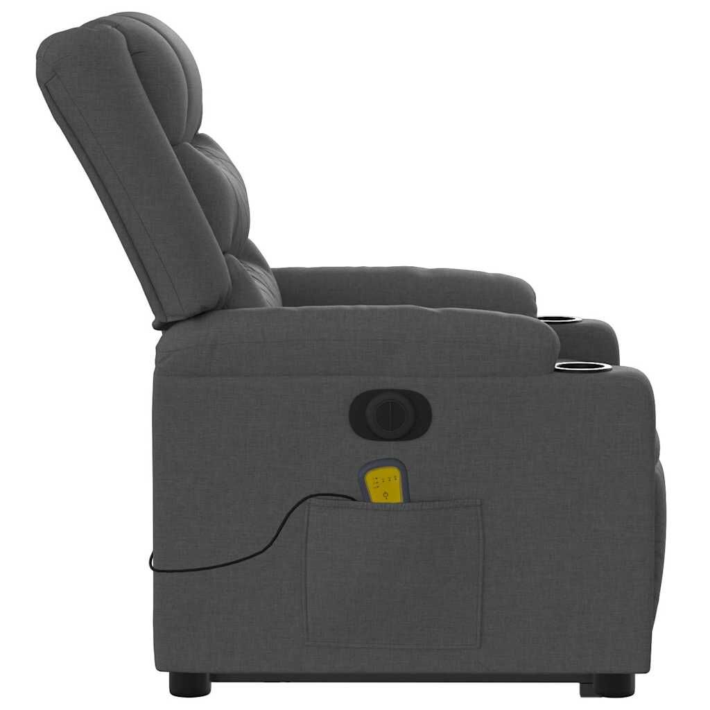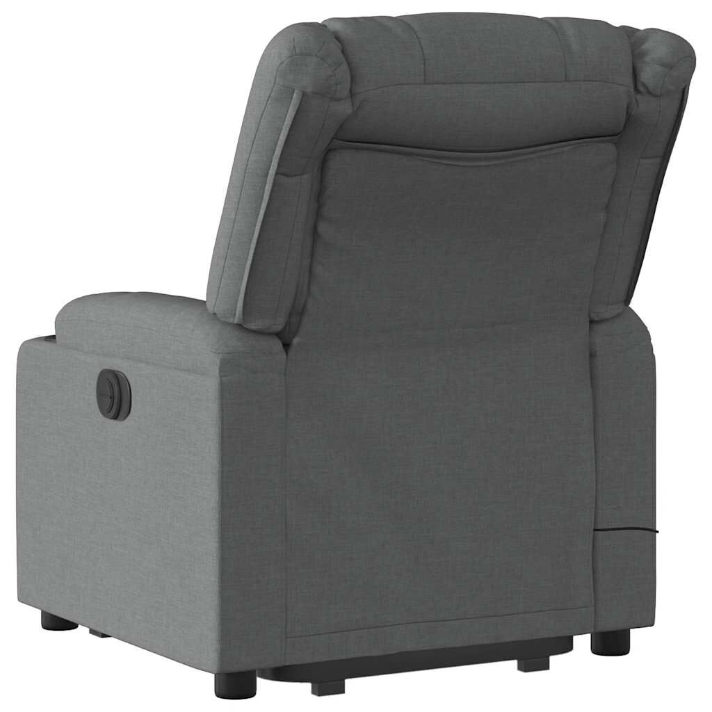 Sit back and drift away in this highly comfortable electric stand up massage recliner chair! Power lift function: This recliner chair for the elderly is equipped with an electric motor for the lifting-up function. Thanks to the function that pushes the entire chair up, you can easily stand without stressing your back and knees with a simple press of the button.Electric reclining function: This reclining chair is also equipped with an electric motor that helps automatically adjust the footrest and backrest to any position as per your comfort with a simple press of the button on the side of the chair. This feature allows for a maximum tilt of 135 degrees. Additionally, the backrest can go automatically back to the original place with an easy press of the button.Vibration function: The featured 6 massage points let you experience a better-targeted massage. Additionally, the included hand control allows you to pick different massage programs. The massage function is powered by the USB connector that requires a certified 5V USB power source (not included).Comfortable seat experience: The thickly padded seat, backrest, and wide armrests covered in fabric provide a cosy and warm sensation, making you feel embraced while seated. The fabric features a simple and clean look and is breathable and durable.Convenient cup holders and side pocket: This armchair has two convenient cup holders for your drinks and a side pocket for your remote control or keeping your essential items within easy reach.Solid and stable frame: The frame made of wood and metal provides a strong structure and stability. This reclining armchair is comfortable and durable.