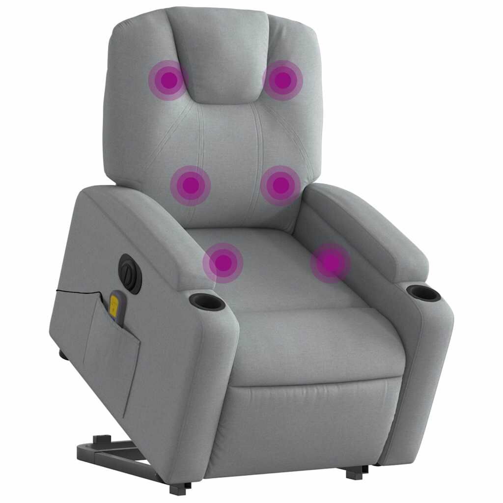Sit back and drift away in this highly comfortable electric stand up massage recliner chair! Power lift function: This recliner chair for the elderly is equipped with an electric motor for the lifting-up function. Thanks to the function that pushes the entire chair up, you can easily stand without stressing your back and knees with a simple press of the button. Electric reclining function: This reclining chair is also equipped with an electric motor that helps automatically adjust the footrest and backrest to any position as per your comfort with a simple press of the button on the side of the chair. This feature allows for a maximum tilt of 135 degrees. Additionally, the backrest can go automatically back to the original place with an easy press of the button. Vibration function: The featured 6 massage points let you experience a better-targeted massage. Additionally, the included hand control allows you to pick different massage programs. The massage function is powered by the USB connector that requires a certified 5V USB power source (not included). Comfortable seat experience: The thickly padded seat, backrest, and wide armrests covered in fabric provide a cosy and warm sensation, making you feel embraced while seated. The fabric features a simple and clean look and is breathable and durable. Convenient cup holders and side pocket: This armchair has two convenient cup holders for your drinks and a side pocket for your remote control or keeping your essential items within easy reach. Solid and stable frame: The frame made of wood and metal provides a strong structure and stability. This reclining armchair is comfortable and durable.