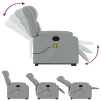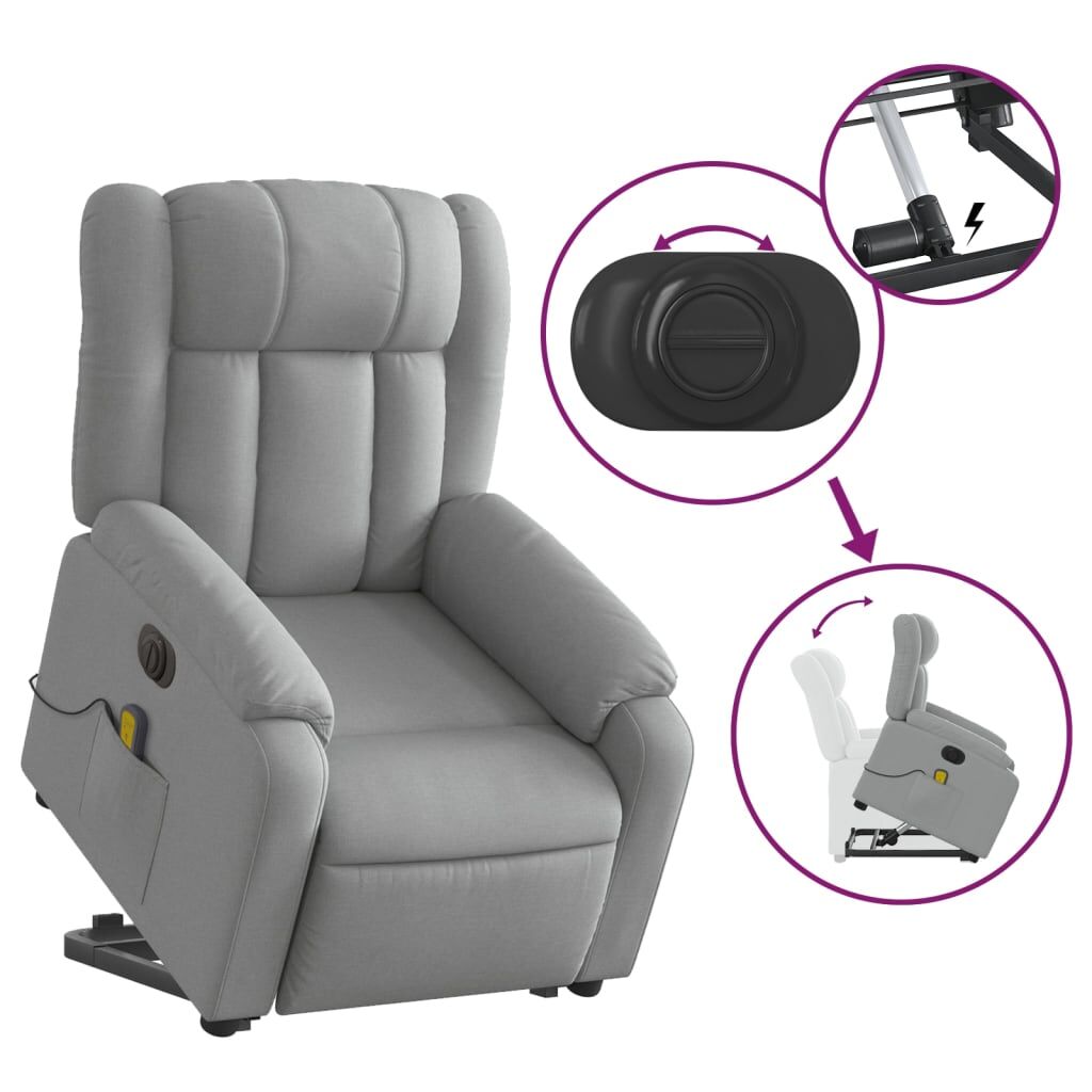Sit back and drift away in this highly comfortable electric stand up massage recliner chair! Power lift function: This recliner chair for the elderly is equipped with an electric motor for the lifting-up function. Thanks to the function that pushes the entire chair up, you can easily stand without stressing your back and knees with a simple press of the button.Electric reclining function: This reclining chair is also equipped with an electric motor that helps automatically adjust the footrest and backrest to any position as per your comfort with a simple press of the button on the side of the chair. This feature allows for a maximum tilt of 135 degrees. Additionally, the backrest can go automatically back to the original place with an easy press of the button.Vibration function: The featured 6 massage points let you experience a better-targeted massage. Additionally, the included hand control allows you to pick different massage programs. The massage function is powered by the USB connector that requires a certified 5V USB power source (not included).Comfortable seat experience: The thickly padded seat, backrest, and wide armrests covered in fabric provide a cosy and warm sensation, making you feel embraced while seated. The fabric features a simple and clean look and is breathable and durable.Convenient side pocket: This armchair has a side pocket for your remote control or keeping your essential items within easy reach.Solid and stable frame: The frame made of wood and metal provides a strong structure and stability. This reclining armchair is comfortable and durable.