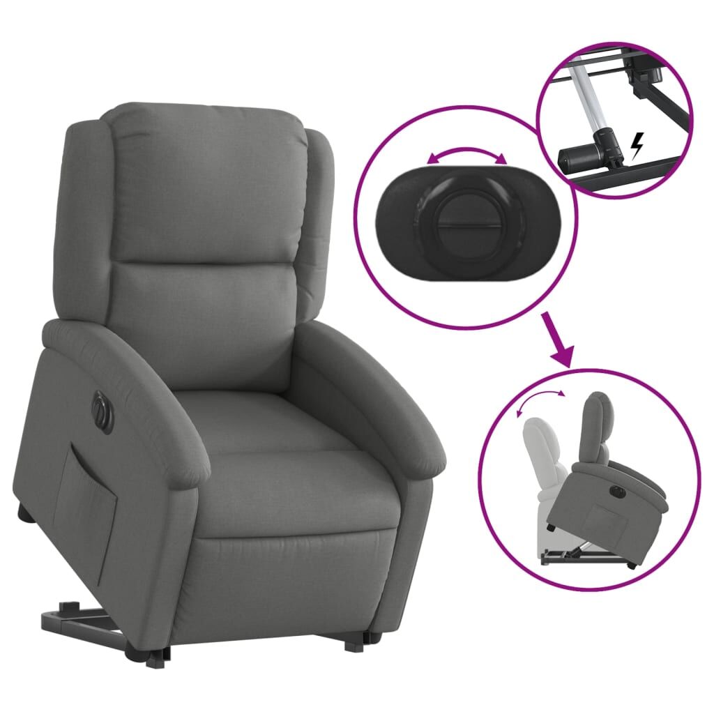 Sit back and drift away in this highly comfortable electric stand up recliner chair! Power lift function: This recliner chair for the elderly is equipped with an electric motor for the lifting-up function. Thanks to the function that pushes the entire chair up, you can easily stand without stressing your back and knees with a simple press of the button. Electric reclining function: This recliner chair is also equipped with an electric motor that helps automatically adjust the footrest and backrest to any position as per your comfort with a simple press of the button on the side of the chair. This feature allows for a maximum tilt of 135 degrees. Additionally, the backrest can go automatically back to the original place with an easy press of the button. Comfortable seat experience: The thickly padded seat, backrest, and wide armrests covered in fabric provide a cosy and warm sensation, making you feel embraced while seated. The fabric features a simple and clean look and is breathable and durable. Convenient side pocket: This armchair has a side pocket for you to keep your essential items within easy reach. Solid and stable frame: The frame made of wood and metal provides a strong structure and stability. This reclining armchair is comfortable and durable.