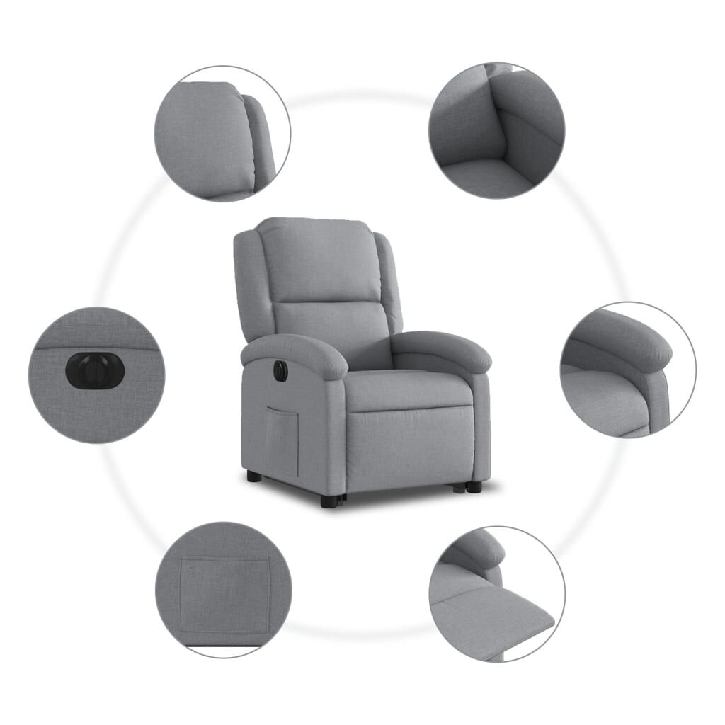 Sit back and drift away in this highly comfortable electric stand up recliner chair! Power lift function: This recliner chair for the elderly is equipped with an electric motor for the lifting-up function. Thanks to the function that pushes the entire chair up, you can easily stand without stressing your back and knees with a simple press of the button. Electric reclining function: This recliner chair is also equipped with an electric motor that helps automatically adjust the footrest and backrest to any position as per your comfort with a simple press of the button on the side of the chair. This feature allows for a maximum tilt of 135 degrees. Additionally, the backrest can go automatically back to the original place with an easy press of the button. Comfortable seat experience: The thickly padded seat, backrest, and wide armrests covered in fabric provide a cosy and warm sensation, making you feel embraced while seated. The fabric features a simple and clean look and is breathable and durable. Convenient side pocket: This armchair has a side pocket for you to keep your essential items within easy reach. Solid and stable frame: The frame made of wood and metal provides a strong structure and stability. This reclining armchair is comfortable and durable.