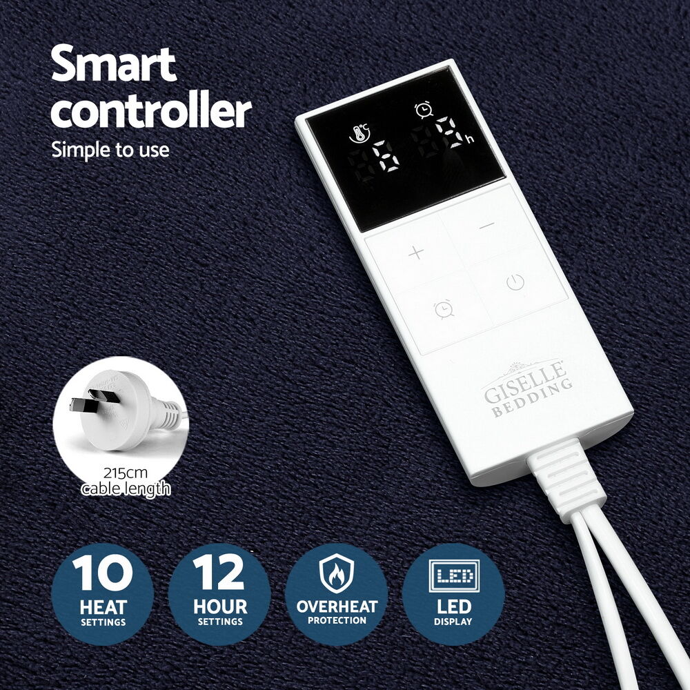Get that warm and cosy feeling every day with a Giselle Bedding Electric Throw Rug. The double-sided throw rug is made from premium flannel and sherpa fabric, our electric throw rug is just the thing to help you cut down on costly heating bills while still enjoying the heat up-close. The throw rug has all the features of our electric blankets with up to 10 temperature settings, a 12-hour timer, overheat protection, automatic shut-off and a detachable controller with LED display so you can always be in control of the temperature. It is anti-dust mite and bacteria and is machine washable for a clean blanket time and time again. Keep your bedroom or living room cosy and comfortable with a warm and huggable Giselle Bedding Electric Throw Rug.