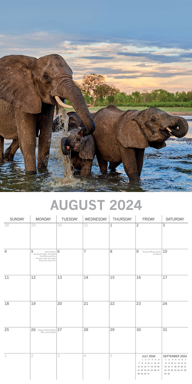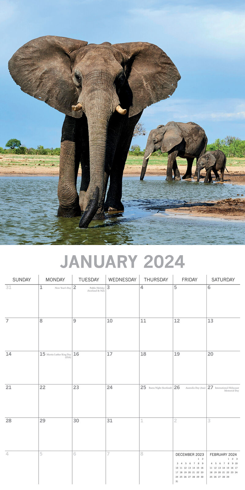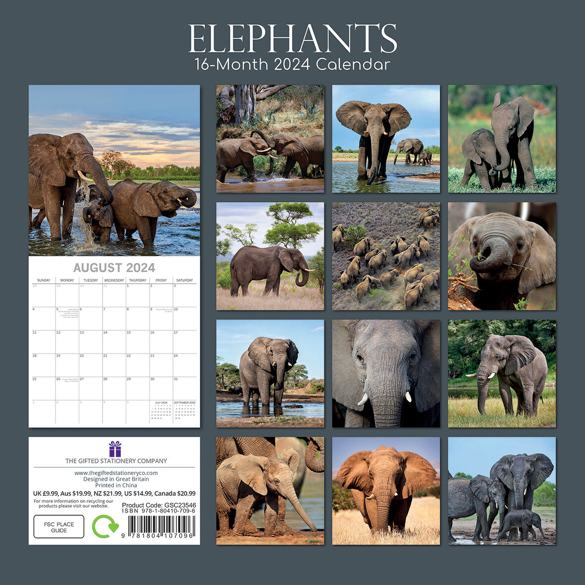 Twelve stunning full color photographs depict the power, intelligence and social nature of elephants, the largest land animals on earth.  Brand New Calendar with Beautifully design, Sealed in Original Packaging, each calendar includes a large grid running from Sunday to Saturday. Publisher: The Gifted Stationery Co. Dimensions: 30cm (w) x 30cm (h) closed; 30cm (w) x 60cm (h) opened Time Span: 16 months (January to December 2024 monthly, September to December 2023 on-a-page) 2024 Square Wall Calendar featuring beautiful colour photographed images for every month of the year. Like most Wall calendars, this one comes with: