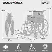 This Equipmed wheel chair features height adjustable footrests that also swing out for easy access onto the wheel chair. Combined with a generous 51cm seat width, the comfy padded armrests and a padded seat with generously proportioned backrest ensure a comfortable ride. The armrests have quick release levers which allow them to swing back to allow for convenient access at tables when dining. And, thanks to the 2 second folding action and ergonomic handles, it makes for a relaxing day out for any helpers, too!