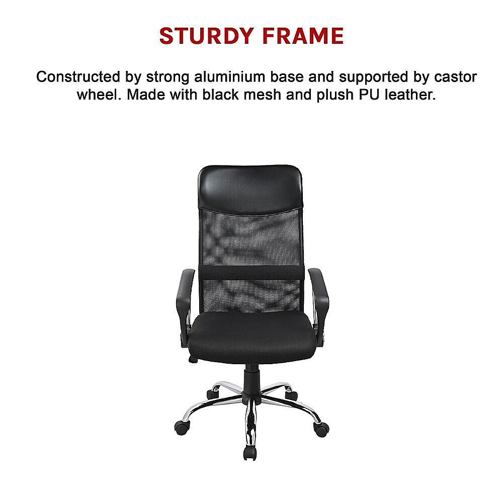 The chair is constructed with plush PU leather as well as a black mesh for superior comfort and no-fuss maintenance. A convenient gaslift makes height easily adjustable from 112.5cm to 121.5cm. And a handsome chrome base with 5 nylon castor wheels provide an easy way to rotate and wheel around.