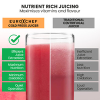 Designed with quick assembly and easy cleaning in mind, its dishwasher-safe parts make cleanup a breeze. Durable, efficient, and easy to use, the EuroChef Cold Press Juicer is the ultimate addition to any kitchen, providing fresh and tastier nutrient-rich juices with ease.
