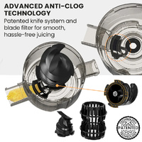 Advanced anti-clog technology, featuring a patented knife system and blade filter, ensures smooth, hassle-free juicing every time. The smart reverse function prevents blockages, and the juicer’s quiet operation, at under 70dB, makes it ideal for any time of day. With an included pulp container and juice jug, it’s perfect for small to medium batches.